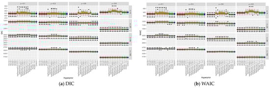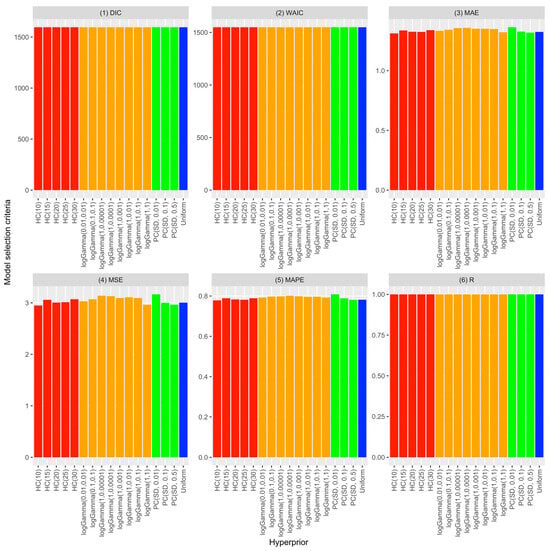 According to leave-one-out cross-validation, Figure 5 displays the evaluation results for each hyperprior distribution, including their corresponding hyperparameter values. The findings presented in the figure align with simulation results, highlighting the logGamma hyperprior’s high sensitivity to alterations in both shape and scale hyperparameter values. This sensitivity is evident in the substantial variations observed in the DIC, WAIC, MAE, MAPE, MSE, and R criteria when using logGamma(1,1). Although the values of DIC, WAIC, MAE, MAPE, and MSE are comparatively smaller and R is larger than those of other hyperpriors, this outcome raises concerns about potential overfitting issues. On the other hand, different hyperparameter values for logGamma yield diverse results in terms of DIC, WAIC, MAE, MAPE, MSE, and R. According to the observations from Figure 4, it is evident that, overall, distributions other than the hyperprior yield comparable model fit values and predictive abilities.