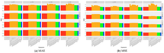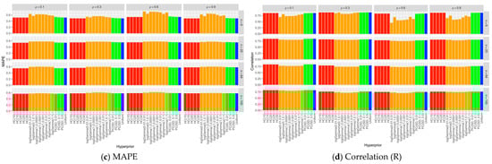 Predictive performance criteria: (a) MAE, (b) MSE, (c) MAPE, and (d) the Correlation between Predicted and Out-of-Sample Values. (Different colors indicate different hyperprior distributions).