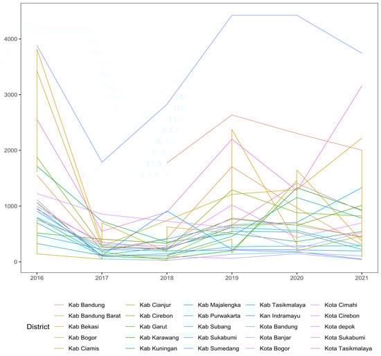 Annual Temporal Trends of Dengue Cases in 27 Districts of West Java from 2017–2021.