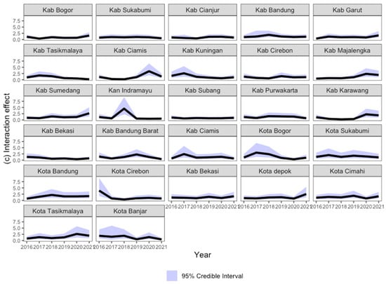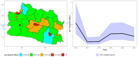 Table 3 presents the inference results for the spatiotemporal hyperparameters of the model. The fraction variance analysis reveals that the most influential component in explaining dengue risk in West Java is the spatially structured effects, accounting for 36.112%. Following closely are the temporally structured effects at 32.824%, and lastly, the interaction effects contribute with a value of 31.063%. Figure 6 illustrates the spatially and temporally structured effects and their interaction with the disease risk.