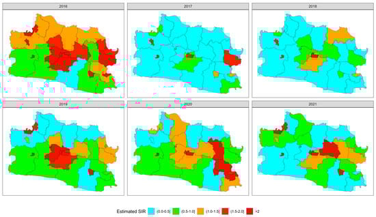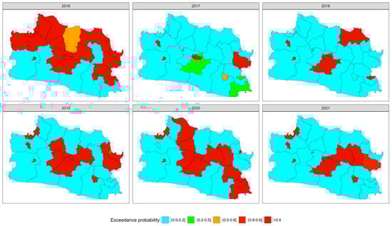 Figure 7 illustrates the relative risk for each district in West Java throughout the 2016–2021 period, and Figure 8 depicts the significance of high risk, as measured by exceedance probability. The calculated results of these two values reveal changes in high-risk areas during the 2016–2021 period, indicating a dynamic pattern in the spread of dengue disease in Indonesia.