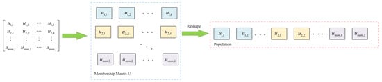 Step 1: Use Equation (1) to randomly initialize the population and assign the parameters a and z, where means the population dimension, with each dimension including all the elements in the membership matrix , as shown in Figure 2: