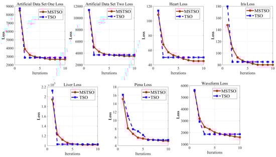 From Appendix A, we can see that MSTSO performs well on most test functions. Specifically, for the unimodal test function F1, although MSTSO fails to stably obtain the optimal solution, the MSTSO optimization accuracy is significantly better than that of other algorithms, reaching nine orders of magnitude, illustrating that MSTSO has excellent local search ability. The multimodal functions F2–F8 are often used to test the global search ability of algorithms, which usually have multiple local minimums, so excellent algorithms can jump out of local minima to obtain global optimal values. MSTSO performs best on all seven of these functions, ranking behind RSA only on F8. For TSO, MSTSO performs better on all multimodal functions, indicating that MSTSO’s improvement strategy significantly improves TSO’s global search ability. F9–F18 and F19–F28 are mixed and combination functions, respectively. These two types of functions have complex structures better able to test the ability of algorithms to solve complex optimization problems. As can be seen from Appendix A, MSTSO ranked second only on F19. In the remaining mixed functions and combination functions, MSTSO is the best performer, achieving significantly better results than TSO, which shows that the improvement strategy proposed in this paper has well enhanced the ability of algorithms to solve complex structural problems. It has the potential to better solve complex optimization problems in the real world.