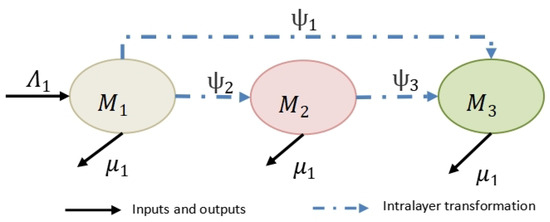 Next, we give a detailed description of the specific propagation process of the R layer and its corresponding parameters. Firstly, because the subjective judgment of human beings and the degree of interest in the event will be changed by external influences, the sections of the public will change dynamically over time. Therefore, there are inputs and outputs in the R layer at all times, and we assume that the newly joined unknowns enter the R layer with probability and the already existing sections of the public exit the system with probability . Secondly, most rumors do not have the nature of rumors when they are initially spread, but are spread only as information. Therefore, we assume that the unknowns, when exposed to the information, may either disseminate the information directly without thinking or remain silent because they are not interested in the information. Therefore, we assume that the probability that the unknowns will be transformed into information disseminators is and the probability that they will be transformed into silencers is . In addition, information disseminators may develop a deterministic attitude towards information after being influenced by rumors spreading in real social networks. Therefore, we assume that the probability that a information disseminator will transform into a rumor spreader is , the probability that he/she will transform into a rumor debunker is , and the probability that he/she will transform into a silencer is . Finally, rumor spreaders may change their negative attitudes or lose interest in rumors over time or for their own reasons after being positively influenced by rumor debunkers in real social networks. Therefore, we assume that the probability of a rumor spreader changing to a rumor debunker is and the probability of changing to a silencer is .