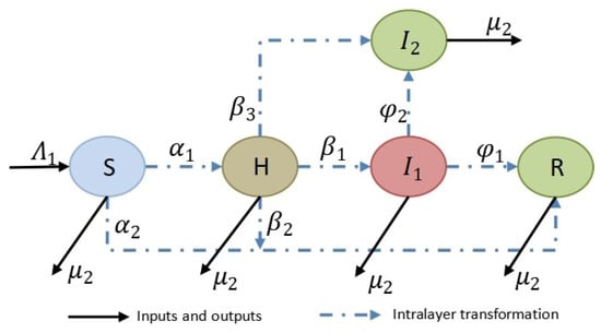 The sections of the public in the Reality (R) layer are classified into five types, namely, Unknowns S (Suspicious), a section of the public that indicates susceptibility to unknown rumors, Information Disseminators H (Hesitate), a section of the public that indicates known information and disseminates information directly without thinking, Rumor Spreaders (Infective), a section of the public that indicates known information and spreads rumors with a negative attitude, Rumor Debunkers (Independent), a section of the public that indicates that information is known and spreads disinformation in a positive manner, and Silent R (Reticent), a section of the public that expresses a loss of interest in a topic and no longer makes relevant statements. At a certain moment, each section of the public may be in one of the above five states, and the specific transformation relationship is shown in Figure 2.