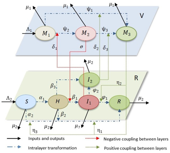 In the modern era, a large number of social groups acting as media join in the spread of rumors, and their guiding effect is extremely obvious. As the main body of rumor dissemination, a person’s subjective judgment on rumors also has a great influence on rumor dissemination. Considering the above factors, a virtual reality two-layer rumor propagation model is established, where the virtual layer (V) denotes the network constructed by media such as virtual online social network platforms like Facebook, TikTok, etc., which spreads or clarifies the rumors through the form of articles, videos, etc., and the real layer (R) denotes the social network constructed by real human beings, such as friends, family members, colleagues, etc., through language, text messages, etc., which is used to share or refute rumors.
