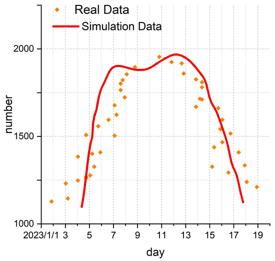 In this study, we take the data relating to the “Hu Xinyu disappearance case” obtained from “Baidu Index” as an example. By fitting the system parameters of the model (1) (with specific parameter values as listed in the 6th column of Table 2) in the ratio of 4:1, we obtain simulation curves for rumor spreaders I1 based on the model, as shown by the red curve in Figure 4. Upon comparison with the real data represented by orange scattered points in Figure 4, it is evident that the trends of the two datasets are consistent. Therefore, model (1) can effectively predict real rumor propagation behavior.