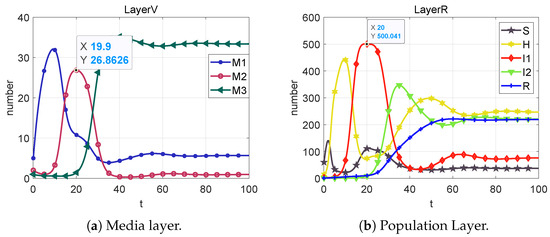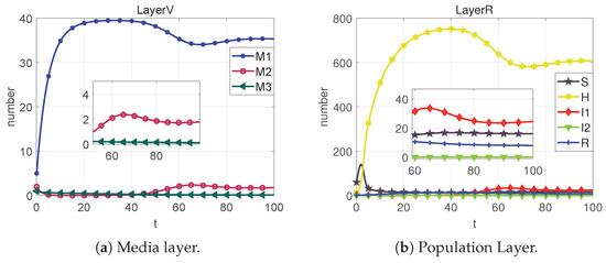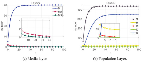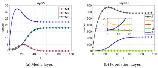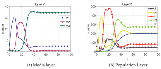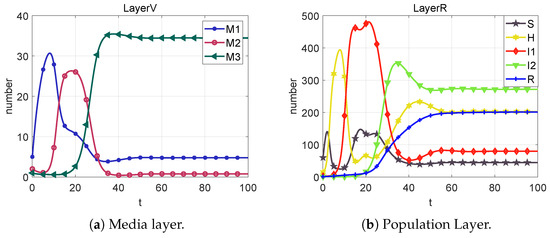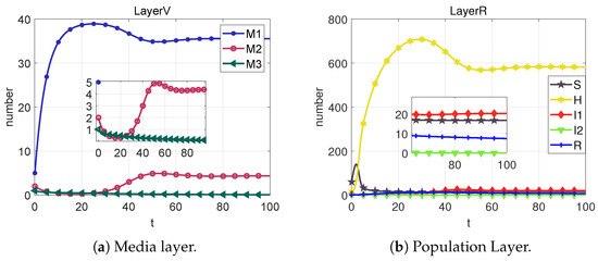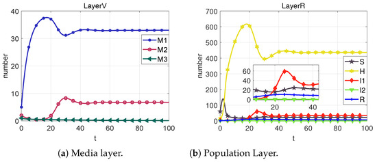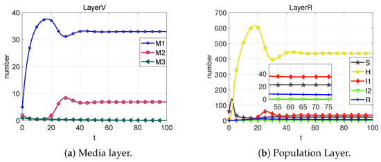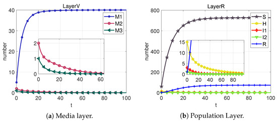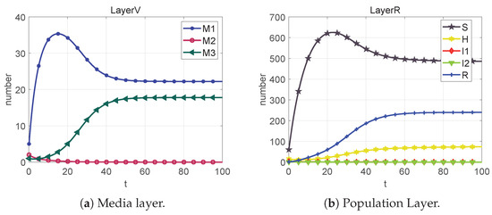 Based on the sixth column of Table 2, we can calculate that . From Figure 9, we can obtain that the system cannot reach the rumor-free equilibrium point (neither I1 nor M2 eventually converge to 0) when R < 1 is not satisfied. However, each section of the public eventually converges to a number that is not 0, which we call the local equilibrium point .