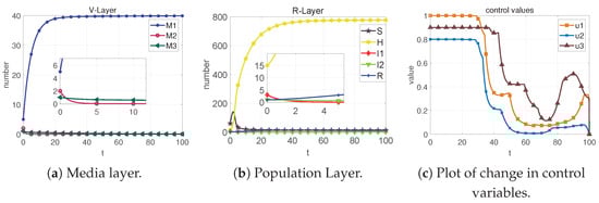 Many articles have discussed optimal control [18,19,20,21,22,23,24,25,26,27,28,29,30,31,32,33], with Ding, Li, et al. [20] establishing the Controlled Rumor–Truth Spreading Model, which considers the isolation of rumor spreaders and the effects of time. They used the variational method to obtain optimal control quantities and conducted simulations. Conversely, Xupeng Luo, Haijun Jiang, et al. [30] considered the multilingual environment and intervention mechanism, establishing the I2SR rumor propagation model. They obtained optimal control conditions using Pontryagin’s minimum principle. However, none of the above-mentioned articles fully consider media control.