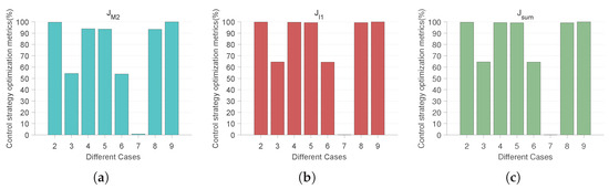According to Table 3, we can obtain the statistical graphs of the various components of the control strategy optimization metrics under different cases shown in Figure 18. We use the control strategy optimization metric to measure the control capability of each control case. That is, the cases with different controls added (Cases 2–9) are compared with the case without controls added (Case 1) to find the corresponding ratio. Thus, it can be concluded that the larger the ratio, the better the control method.