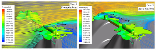 Due to the complex shape of the landscape platforms and the unique installation location, a towering peak, the wind flow undergoes critical separation, resulting in local vortices, as depicted in Figure 6. The figure illustrates the wind flow streamlines from the west (Case 6) and northwest directions (Case 6). As can be seen, the wind flow from the west separates around the edges and domes of the platforms, creating small vortices. These vortices led to the nonuniform distribution of wind pressure on the platforms and the appearance of negative pressure. Furthermore, as the wind flow reattached, a positive wind pressure occurred on the other side of the platforms. This force distribution, coupled with the lifting forces resulting from the upwards redirected wind flow, imposes a significant torsional wind load on the platforms. This torsional effect threatens the structural stability of such lightweight metal structures, and under extreme weather conditions, this may cause uplift or detachment of the platforms’ wings. Additionally, the glass bridge connecting the two platforms appears to be more susceptible to damage, and wind-induced vibrations may occur.