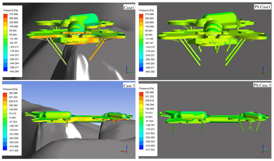 The platforms’ wind-induced pressure resulting from the wind flow from seven different directions is depicted in Figure 5 and Figure 7. The figures show that the sides of the platform facing the wind flow direction experience significant pressure and lifting forces. This effect is particularly evident in Cases 5 and 6, where the wind-induced positive pressure reaches a maximum value of approximately 750 Pa. This is attributed to the relatively open topography of the western and northwestern regions of the terrain. As in Case 6, the wind flow experienced a speeding-up effect by the relatively shorter mountain in the west. In Case 7, the northwestern mountains redirected the wind flow toward the side peak, resulting in higher wind pressure. However, due to the shading effect of the mountains in the northeast direction (Case 4), the platforms, especially the one on the mountainside, were subjected to a significant negative wind pressure. This pressure results from the large vortex formed behind the mountains, attempting to lift the platforms off their bases.