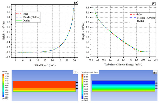 where U(z) is the wind speed, k(z) is the turbulence kinetic energy, ε(z) is the turbulence dissipation rate, τ is the wall shear stress, and kg m−3 is the air density. The values of the constants mentioned in Equations (5)–(7) were previously calculated by Richards and Norris [26].
