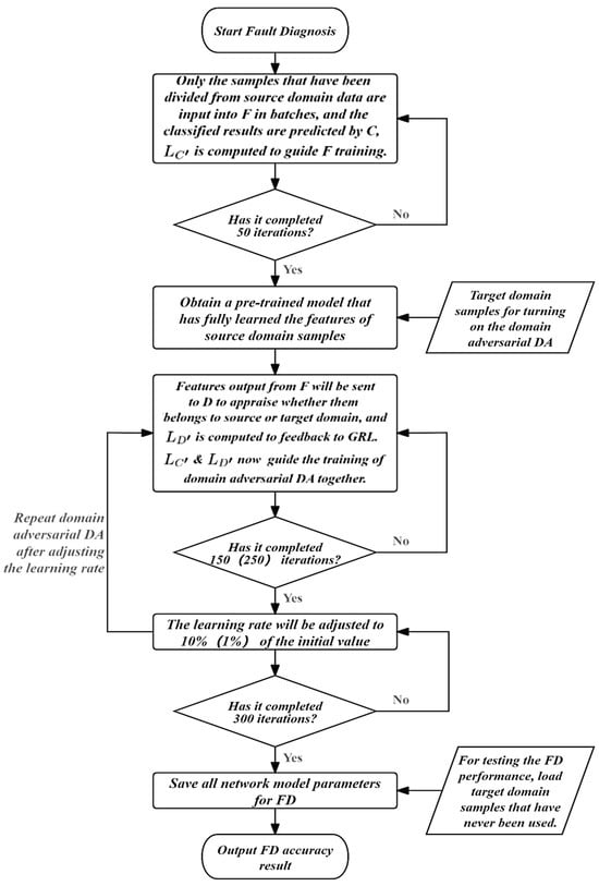 Step 3: At the 51st iteration start DA, target domain data during domain adversarial are also fed as samples to the F, which shared parameters.