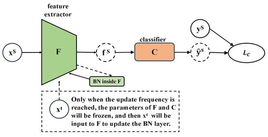 Step 1: Only the samples divided from the source domain data are input into F by batch, and the classified results are predicted by C.