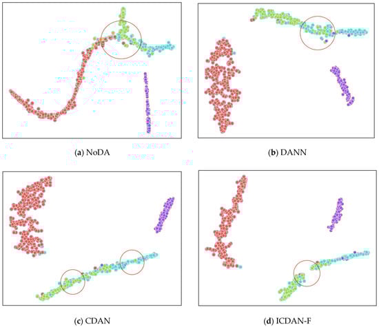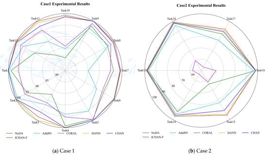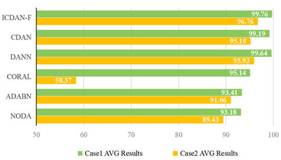 For Case 1’s 12 tasks, observation of the results reveals that NoDA shows an average result of 93.18 as the baseline. This indicates that FD across different working conditions faces difficulties when DA is not employed and there is still room for improvement. Overall, the results achieved in the experiment by the five different DA methods used are acceptable as they do improve the domain displacement problem faced, yielding a higher overall average accuracy than the baseline. We included two statistical metric-based DAs, AdaBN and CORAL, but they only bring a slight improvement; they achieved 93.41 and 95.14 average results, respectively. The adversarial-based DA are stunning, with 99.64 and 99.19 average results for the DANN and CDAN methods, respectively, and our ICDAN-F method takes it a step further to achieve the highest of 99.76. ICDAN-F completes FD within Case 1’s eight tasks with perfect performance, which is not possible with other comparison methods. It validates that our improved method is both correct and effective.