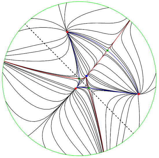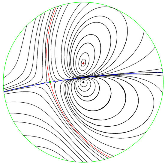 Using the P4 program [23] we draw the phase portrait of system (20) for fixed values of parameters. We set . Then, the system is