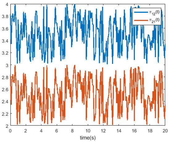 In this scenario, we define and as random functions generated using MATLAB, and they satisfy the constraint with the additional conditions and . Under (12) and (13), and are depicted in Figure 1. It is evident that the transition rates exhibit time variation. Furthermore, the vertices of the transition rate matrix are determined as follows: