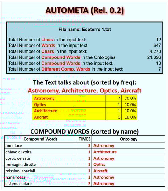 AUTOMETA accesses terminological ontologies where each entry is assigned an ontological identification, comprising tags (or labels) referencing one or more knowledge domains or semantic fields (metadata) where the entry is commonly used and holds an unambiguous meaning. This tagging system is referred to as a lexical ontology, establishing a distinct and unequivocal relationship between a multi-word unit in a terminology dictionary and one or more tags denoting the semantic domain(s) to which it pertains. Essentially, it specifies the particular domain(s) of knowledge where that multi-word unit possesses a well-defined meaning. To illustrate, the multi-word unit analisi cliniche (clinical analysis) is tagged with MEDIC, signifying Medicine, while the multi-word unit carta di credito (credit card) is tagged with ECONO, signifying Economy. Each ontology undergoes creation and verification under the supervision of experts in the respective sector. It is important to note that our lexical ontologies do not serve encyclopedic purposes. For instance, while they may not encompass Subnuclear Physics, they provide all the ontology used by Subnuclear Physics to unequivocally reference a set of established, standardized, and universally shared knowledge.