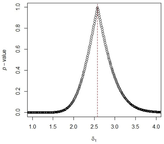 Suppose that we wanted to test . We created the progressive type I interval censored sample for the failure times of products from two production lines. Let the termination time T = 0.5 with a number of inspections m = 5, the equal length of inspection interval t = 0.1 (thousand cycles), and the pre-specified removal percentages of the remaining survival units given by (p1, p2, p3, p4, p5) = (0.05, 0.05, 0.05, 0.05, 1.00).