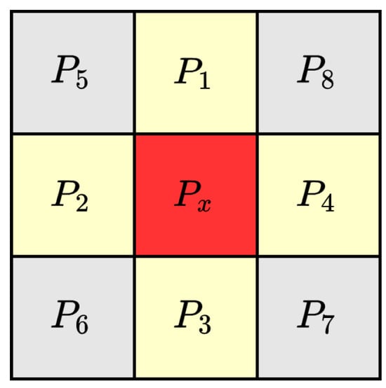Li et al. [19] proposed a pixel prediction method based on the similarity of edge information across channels. They applied different prediction strategies for edge textures with varying levels of complexity. The edge texture, depicted in Figure 1, is accomplished through the pixel’s eight adjacent pixels as: