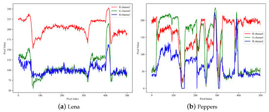 The characteristics and texture structures among RGB channels exhibit remarkable similarities, manifested as a fundamental consistency in the pixel value variations across the three channels. This similarity has been extensively validated through a plethora of experiments. We take the images “Lena” and “Peppers” as examples and select 500 pixels from each image. As depicted in Figure 3, the pixel value trends of these pixels show similar monotonicity in the RGB channels.