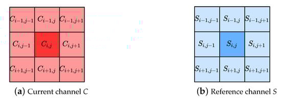 We denote the current channel being processed as C and the reference channel for the current channel as S. Specifically, the current pixel being processed is , where i and j represent the row and column numbers, respectively. Similarly, denotes the pixel in the reference channel at row i and column j. To more accurately denote the local complexity of , we extend its local complexity context to a pixel block centered at . Likewise, the local complexity context of in the reference channel is denoted as a pixel block centered at . The local complexity contexts of , and are shown in Figure 4a,b, respectively. The local complexity contexts for and are denoted as and , and each of them contains 8 pixels, i.e., and . Within , the maximum and minimum values are represented as and , while within , they are represented as and . We integrate the pixel variation in the local complexity contexts of the current channel and the reference channel and define the local complexity of the current pixel as