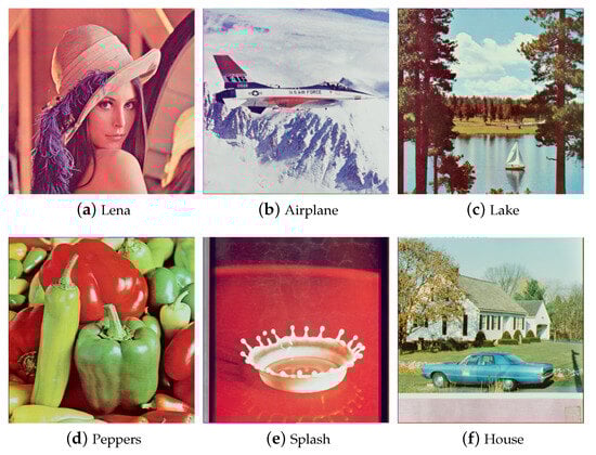 We use the USC-SIPI (http://sipi.usc.edu/database/database.php?volume=misc (accessed on 20 December 2023)) and Kodak (http://r0k.us/graphics/kodak/ (accessed on 20 December 2023)) datasets as experimental images to evaluate the algorithm’s performance. We compare the proposed algorithm with the state-of-the-art algorithms, measuring image fidelity using peak signal-to-noise ratio (PSNR) values. Figure 6 illustrates six classic color images of size from the USC-SIPI dataset: Lena, Airplane, Lake, Peppers, Splash, and House. The Kodak dataset contains 24 color images of size or , on which we test the algorithm’s performance. The secret data used in the experiments is a bit sequence composed of 0 and 1 generated by a random function. We run our method and the compared methods on a PC equipped with Intel Core i7-9700K CPU (Intel Corporation, Santa Clara, CA, USA), 16 GB memory, and Windows 10 operating system, using MATLAB R2020a environment.