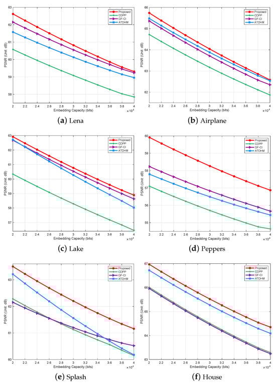 To further validate the superiority of our proposed method in terms of image fidelity, we conduct an experiment in which we plot the PSNR values against the amount of data embedded. The experiment starts with 20,000 bits, increasing in increments of 2000 bits, as depicted in Figure 7. This figure illustrates the trend of PSNR values with respect to data embedding quantities. Our method consistently maintains a high PSNR value even as the volume of embedded data increases. This observation implies that our method effectively preserves image quality and mitigates the distortion resulting from data embedding. Our method outperforms other methods on six classic USC-SIPI images. For example, when we embed 30,000 bits of data into the Lena image, our method achieves a PSNR of 60.82 dB, significantly surpassing the performance of competing methods. Specifically, it outperforms CDPP [21], GF-CI [20], and ATDHM [23] by 1.74, 0.27, and 0.69 dB, respectively. These results underscore the efficacy of our approach in leveraging inter-channel correlations within the RGB color space and intra-channel pixel-level correlations. Ultimately, this approach enhances both image quality and data-hiding capabilities. The aforementioned experiments contribute to a more comprehensive understanding of the proposed algorithm’s performance under varying data loads. Additionally, they assist in determining the optimal data embedding capacity for achieving the highest image fidelity. These findings will further substantiate the effectiveness of our algorithm in practical applications.