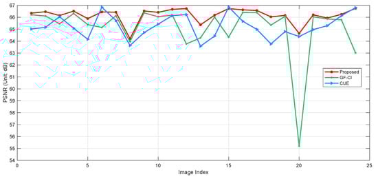 To further validate the effectiveness of the proposed method in data embedding, we conduct an extensive experiment using the Kodak dataset. Specifically, we compare our method with two other methods, GF-CI [20] and CUE [25], by measuring PSNR values. We conduct the experiment with an embedding capacity of 30,000 bits and present the comparative results in Figure 8. Figure 8 illustrates a clear advantage of our proposed method in terms of fidelity for most images. In particular, when embedding 30,000 bits of data, our method outperforms GF-CI [20] and CUE [25] by an average of 1.10 dB and 0.93 dB, respectively, across 24 images. As shown in Figure 8, the PSNR value of the GF-CI algorithm on the 20-th image is significantly lower than that of the other images, mainly due to the complex texture features of the image. During pixel preprocessing, more auxiliary information is needed to prevent the pixel values from overflowing or underflowing, increasing the image’s distortion. Notably, for the 6-th, 15-th, and 24-th images, our method exhibits slightly lower PSNR values compared to CUE. This is attributed to the prominent texture features in these images, where the accuracy of pixel prediction in our adaptive approach is not as high as in smoother images, leading to lower PSNR values in these cases. Nonetheless, when we consider overall performance, our method demonstrates superior image fidelity compared to existing methods.