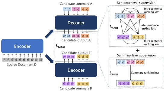 The model learns the ranks of candidate summaries by performing summary-level supervision, which is a supervisory method, over a relatively wide range. Summary-level supervision ensures that the summary score predicted by the model is consistent with the ground-truth rank. The summary score is derived using the encoder–decoder model. To obtain the summary score of the i-th candidate summary, the encoder takes the source document D as the input, and the decoder takes the i-th candidate summary as the input (t is a token, l is the length of the candidate summary). The summary score of a specific candidate summary is the average of the generation probability values for all tokens that constitute the corresponding candidate summary. Thus, the summary score of the i-th candidate summary is