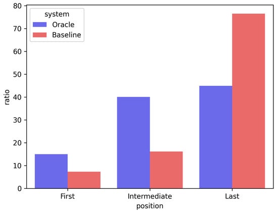 The second limitation highlighted in this study is the bias according to the position of the sentence in the existing encoder–decoder structure re-ranking model. Existing models are biased in assigning a lower prediction score because the sentence is located toward the end of the candidate summary. This study attempted to alleviate this positional bias by supervising the prediction score of a sentence to be aligned with the ground-truth ranking. Figure 5 is a bar chart comparing the position of the sentence to which the existing model BRIO [8] (expressed as “Baseline”) and the proposed model (expressed as “Proposed”) assigned the lowest prediction score in one candidate summary and the gold-truth (expressed as “Oracle”). “First” means the first sentence of the summary, “Last” means the last sentence, and “Intermediate” means all the sentences located between the first and last sentences. When comparing the baseline and proposed models, the probability of predicting the last sentence of the candidate summary as the most poorly-generated sentence was reduced by approximately 20%, from 76% to 57%. In addition, the probability of predicting that the first or intermediate sentence was the least similar to the gold summary increased. Through this analysis, we demonstrated that positional bias is alleviated in the proposed model.