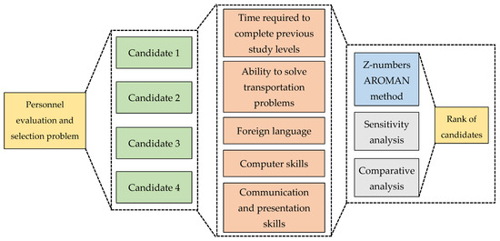 As in any other institution that strives to achieve high goals in development, the issue of young academic staff employment is of crucial importance. This fact was a motive to demonstrate the proposed methodology application in such a case study. Therefore, the Faculty of Transport Engineering at the University of Pardubice is searching for the most suitable Ph.D. candidate to be employed as a new Faculty member. During the competition, four of the most appropriate candidates were shortlisted. Since the candidates can be evaluated by various criteria, the considered problem can be seen as a typical MCDM problem. One of the recently developed MCDM methods that will be applied to this case is the AROMAN method, i.e., its extension in the Z-numbers fuzzy environment. By integrating Z-numbers fuzzy sets into the model, it is possible to reflect the hesitations of decision-makers when making their judgments. This method couples both linear and vector normalization techniques to obtain precise data structure to finally rank the alternatives. The selection procedure is done according to the following criteria: time required to complete previous study levels, ability to solve transportation problems, foreign language fluency, computer skills, and communication and presentation skills. The schematic description of the problem is presented in Figure 3.