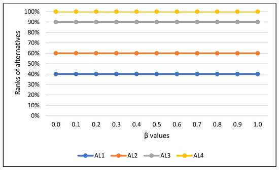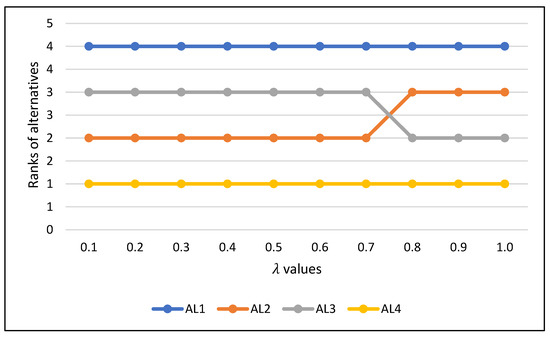 Change in ranking is observed for values of 0.8, 0.9 and 1.0. In this case, Alternative 2 is in the third position, while Alternative 3 is in the second. For other tested values of , Alternative 2 is ranked second and Alternative 3 is third. When it comes to Alternatives 1 and 4, their ranking is not changed for any values. Alternative 1 is always last-ranked and Alternative 4 is the most favorable solution in all scenarios.