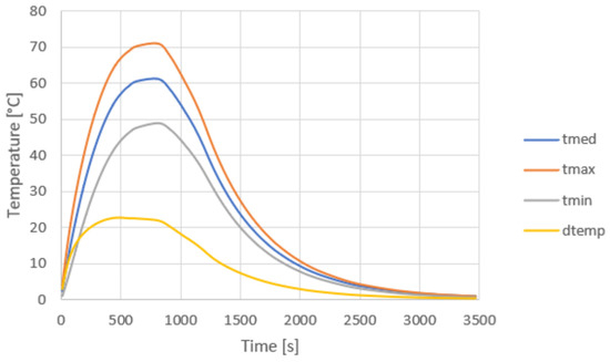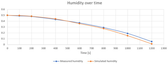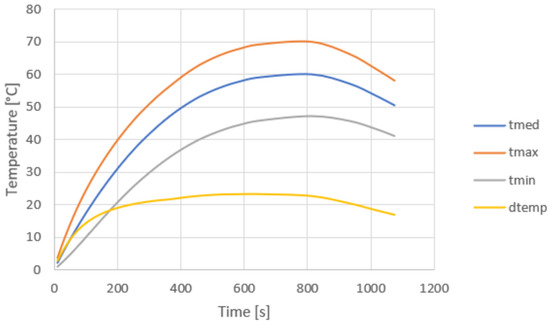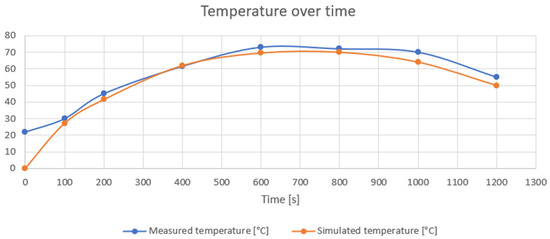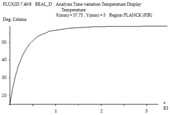 Figure 20 presents the time variation of temperature in the heating process of the dielectric. It can be observed that the temperature rose and stabilised at about 60 °C. In the drying process of the dielectric (Figure 12), the temperature reached a maximum and then decreased because the dielectric no longer absorbed heat.