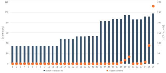 Figure 2 shows the respective optimal solution objectives of the total distances traveled and the corresponding model runtimes of the 36 instances, which remain fairly negligible until Instance 27 and reach 30 min in Instance 28 (see detailed results in Table A3 in Appendix A). Beyond this point, there is an increase, reaching approximately 57 min in Instance 30. However, starting from Instance 34, the runtime rises exponentially, which can be explained by the combinatorial complexity of the number of customers associated with a different number of vehicles/orders per customer (e.g., Instance 36 considers 2172 variables and 3928 restrictions while performing over 2.7 × 108 iterations). It should be noted that the company found this limitation suitable because current operational problems fall under these problem-size dimensions.