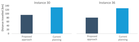 Comparison of total traveled distances and company’s current planning procedures for Instances 30 and 36.
