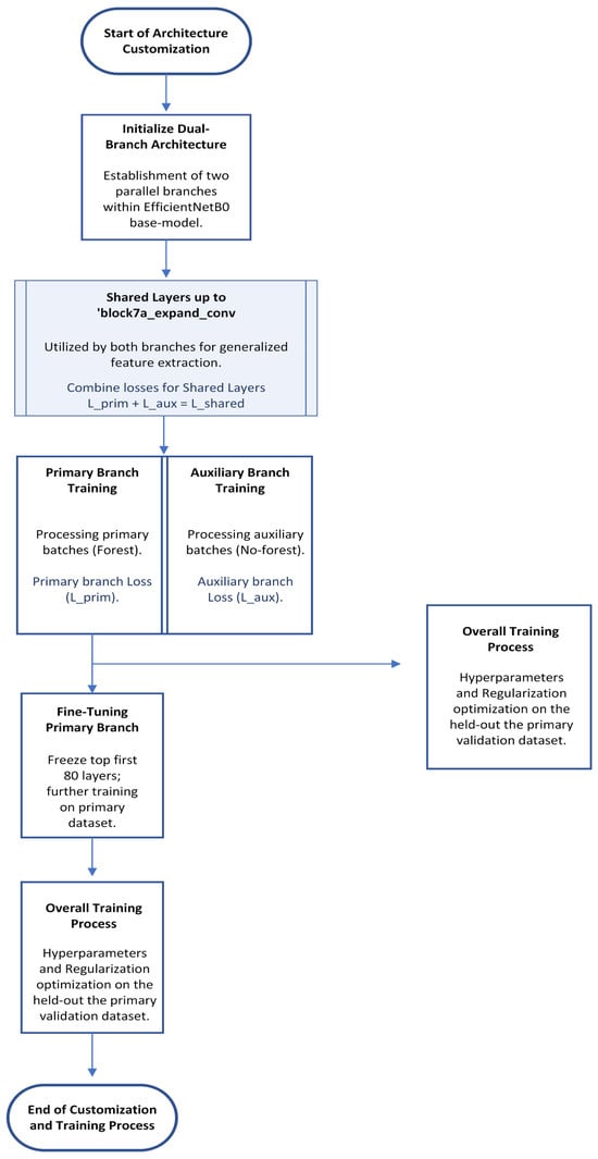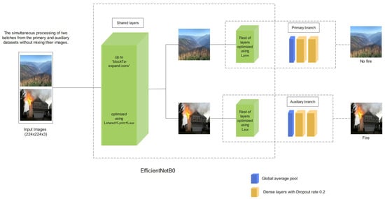This section details the adaptation of the EfficientNetB0 framework into a dual-branch architecture, designed to support a dual-task learning strategy. The primary branch, central to the study, is trained on the wildfire dataset comprising both fire and no-fire forest images. In parallel, an auxiliary branch processes a dataset encompassing non-forest fire and no-fire scenarios. A key innovation in this design is the incorporation of shared layers, utilized by both models. These shared layers are engineered to extract general features applicable to both datasets, enhancing this part of the model’s versatility and efficacy in varied fire detection scenarios. Each branch independently computes its loss function, allowing for specialized learning while maintaining a cohesive overall structure. The shared layers, adept at extracting general features beneficial for both datasets, are updated simultaneously using the combined losses from each model. This strategy of loss integration for the shared layers is devised to mitigate the risk of overfitting the primary model to its specific dataset. By integrating diverse learning inputs from the auxiliary dataset, the model is better equipped to generalize, enhancing its performance in a variety of forest fire detection scenarios. This architectural customization underpins our approach to tackling the complexities of forest fire detection, blending domain-specific learning with general feature extraction. Figure 3 illustrates the training steps of the main dual-task learning process and the information flow through both shared and task-specific layers.