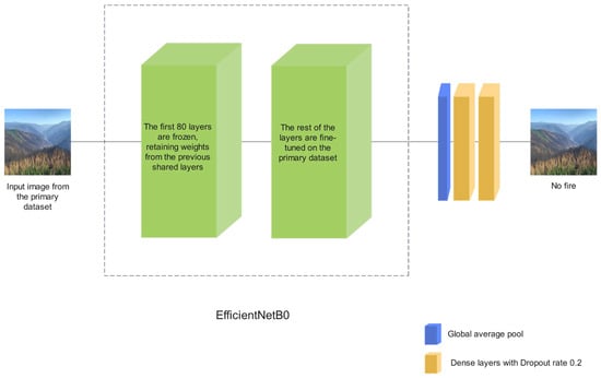 EfficientNetB0 is renowned for its balance of computational efficiency and accuracy [32], a crucial trait for real-world deployment in forest fire scenarios. Furthermore, unlike many state-of-the-art architectures that feature complex interconnections between different blocks, EfficientNetB0’s architecture is uniquely streamlined. This simplicity is vital for the study, where the model is divided into shared layers and task-specific layers. The absence of intricate block interconnections in EfficientNetB0 reduces the complexity of managing these layers, thereby enhancing the practicality and scalability of the system [26].