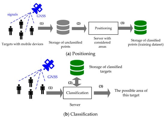 Moreover, we also assume PA = {P0, P1, …, Pm−1} is a set of m polygons in all areas. As shown in Figure 1, the system model includes a platform for finishing the task of a two-phase procedure, i.e., the positioning and classification that a computer server could implement. The considered areas are generated and transformed into the data with polygon type and the system starts. The positioning phase performs the following.
