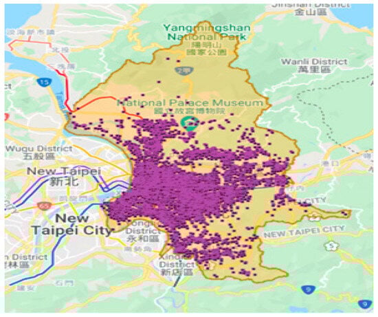 The initial data for the experiment include geographical points and geographical regions within the selected area. These geographical points, totaling 89,209, are represented by check-in places provided by a well-known social networking platform. We can acquire the necessary check-in places according to the method in []. Taiwan’s open data platform can provide the geographical regions of these 12 districts [] or 456 villages []. Figure 3 provides the distribution of the data points, in which the enclosed range is the area and the purple color points are the locations of geographical points, for which 10,000 points are randomly selected from the dataset. Figure 4 provides the class distributions of Type-1 and Type-2.