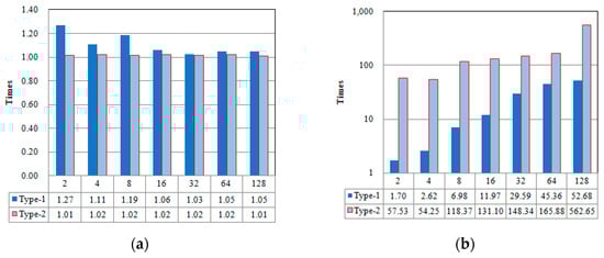 Figure 5 provides comparisons of classification times for Type-1 and Type-2 between wknn versus knn and knn versus awknn. Figure 5a shows the result of wknn and knn. For classification time, in Type-1, wknn is 1.03 to 1.27 times larger than knn; in Type-2, knn is 1.01 to 1.02 times larger than awknn. Figure 5b shows the results of knn and awknn. In Type-1, knn is 2.16 to 52.68 times that of awknn; in Type-2, knn is 57.53 to 562.65 times that of awknn. The above results show that the classification time of wknn is slightly larger than that of knn, and the classification time of knn is much larger than that of awknn. As the training dataset increases, this difference becomes more considerable. The reason is as follows. When knn’s technology is used for a test point, it will search each training data point and calculate the Euclidean distance of the two points. Then, it sorts the training data points based on the Euclidean distance and obtains the closest k neighbors. The technology of wknn is similar to the technology of knn, but it also needs to convert the value of Euclidean distance into a multiplicative inverse. This process causes the technology of wknn to be more complicated than the technology of knn, so the classification time of wknn is also slightly higher than that of knn. It is worth mentioning that both knn and wknn technologies require sorting all training points, which is the most time-consuming part of these two technologies. The search procedure of awknn does not need to calculate the Euclidean distance between the test point and the training point. Therefore, when comparing search procedures, the performance of awknn is better than that of wknn or knn. When comparing the ranking process, awknn only processes a few candidate points, while wknn or knn process all training data points. This is why the classification time of awknn is much lower than that of wknn and knn.