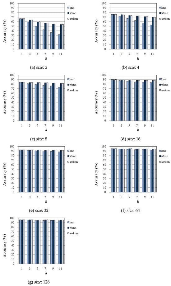 Generally, the classification accuracy provided by KNN technology will increase with the increase in training data points. In Figure 6 and Figure 7, the classification accuracy provided by knn, wknn, and awknn conforms to this characteristic. For example, in Figure 6a, when size value is 2, the classification accuracy of knn is between 31.84% and 66.67%; the classification accuracy of wknn is between 54.05% and 66.67%; the classification accuracy of awknn is between 54.05% and 66.67%. The accuracy ranges from 53.96% to 66.52%. As the training data points (size) increase, the accuracy of these methods will also increase. In Figure 6g, when size value is 128, the classification accuracy of knn ranges from 94.17% to 95.92%; the classification accuracy of wknn ranges from 95.65% to 96.03%; the classification accuracy of awknn ranges from 95.65% to 96.04%.