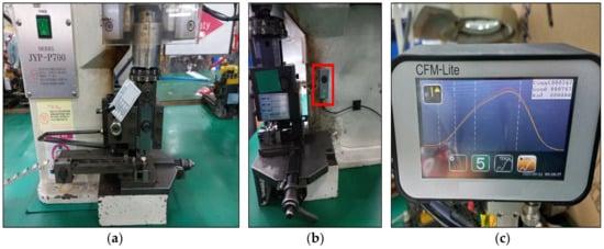 Raw data collection setup: (a) crimping machine; (b) piezoelectric sensor; (c) CFM system.
