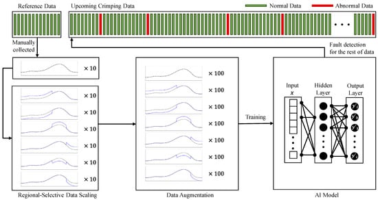 Manufacturing sectors have extensively utilized supervised learning for fault detection and classification, given its efficacy in predicting outcomes from labeled data. While its capabilities are advanced, supervised learning poses challenges, such as the need for extensive labeled data, whose acquisition is a time-intensive and costly process. Unsupervised learning methods can mitigate some of these challenges by processing large volumes of unlabeled data. Semi-supervised learning presents a solution by combining the strengths of both techniques, but due to the unpredictable nature of defects, its utility is also limited by the challenge of acquiring abnormal data. To address the problem, anomaly detection algorithms are proposed to train models using only one-class data. However, in real-world manufacturing practice, there are only a few available reference data for training an AI model. Therefore, it is likely that the models trained solely on a small number of normal data will show low performance against diverse and previously unseen anomalies. Additionally, these algorithms can be subject to overfitting, especially when the available normal data are not comprehensive or representative of all possible normal behaviors. Setting up an appropriate threshold to classify anomalies is another challenge. Achieving high accuracy in fault detection requires a careful balance between a model’s sensitivity and specificity. Conclusively, even as anomaly detection provides a feasible solution, these challenges emphasize the need for a different paradigm for the AI model for fault detection. The proposed methodology is outlined in the following sequence: Section 3.1 details the acquisition of raw data, setting the foundation for our analysis, while Section 3.2 presents the architecture of the overall system, with a particular emphasis on the AI model. This section also covers the creation of synthetic abnormal data, integrating aspects of data augmentation to enhance the model’s robustness and accuracy.