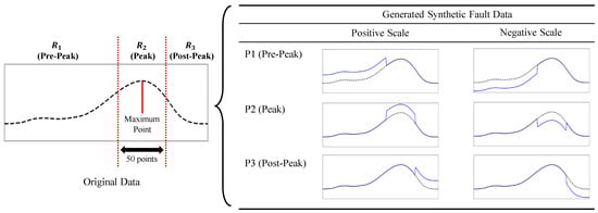 Figure 3 shows the RSDS that this paper introduces to address these complexities as a strategy for generating synthetic abnormal data. The generated synthetic abnormal data can help to generalize AI models with few reference data. Rather than uniformly scaling the entire region, this approach divides the region into smaller sections and then selectively applies scaling. In this way, this approach addresses the challenges related to uniform scaling while also allowing for a more systematic simulation of various defect scenarios. RSDS plays a crucial role in creating synthetic abnormal data, allowing models to learn and adapt to different defect types, even when actual defective data are initially unavailable. In the context of wiring harness manufacturing, this approach involves strategically dividing the original dataset into three distinct regions, each representing a different phase in the data pattern: (Pre-Peak), (Peak), and (Post-Peak). Positive and negative scalings are then applied to the regions based on the standard deviation of the normal dataset, yielding six distinct synthetic fault datasets and enriching the model’s learning spectrum. Using the standard deviation of normal data to scale synthetic faults ensures that they are distinct yet realistic enough for effective anomaly detection. The algorithm below delineates the specific implementation of this approach: