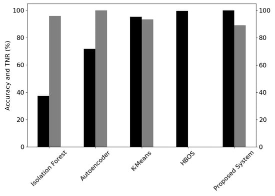Table 2 and Figure 6 provide the performance details of the five fault detection algorithms. The proposed system is notable for its exceptional average accuracy of 99.95%. Its TNR stood at 85.72%, demonstrating its high sensitivity in detecting anomalies. The HBOS demonstrated an impressive accuracy rate of 99.56%. However, the TNR of 0% across all datasets indicates potential overfitting and a lack of effectiveness in detecting anomalies. The k-means algorithm, with 95.39% accuracy and 93.44% TNR, presents concerns in manufacturing contexts. Although its accuracy is close to the proposed system’s accuracy of 99.95%, in a test set of 24,152 normal data, this difference implies a substantial number of misclassifications, which is critical in terms of manufacturing practices. Moreover, while the k-means’ TNR seems better than the proposed system’s TNR of 85.72%, the small sample size of true and false negatives (only 97) suggests that the apparent advantage may not be significant. The results for the Isolation Forest and Autoencoder algorithms indicate a case of anti-fitting. Specifically, the Isolation Forest showed an average accuracy of 40.42% paired with a TNR of 96.0%, while the Autoencoder achieved an average accuracy of 68.92% with a TNR of 100.00%. In summary, the proposed system’s performance demonstrates impressive accuracy and high TNR value. A visualization of prediction results was prepared to help us understand how RSDS enables the establishment of models with only ten training data.