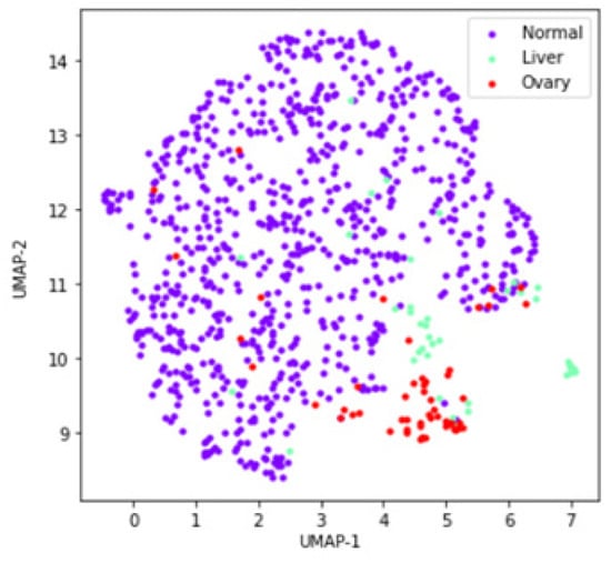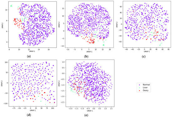 - McInnes, L.; Healy, J.; Melville, J. UMAP: Uniform manifold approximation and projection for dimension reduction. arXiv 2018, arXiv:1802.03426. [Google Scholar]