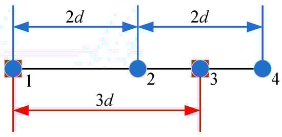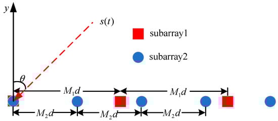 A model diagram of the coprime array is shown in Figure 1. Two uniform linear arrays with different spacings are nested into a coprime array: where subarray 1 has M2 sensors and its spacing is evenly distributed by M1; and subarray 2 has M1 sensors, and its spacing is evenly distributed by M1d. d represents the unit array element spacing, and this satisfies , where represents the signal wavelength. Additionally, the total number of elements is . Based on the above assumption, the index for the collection of element positions is represented as follows: