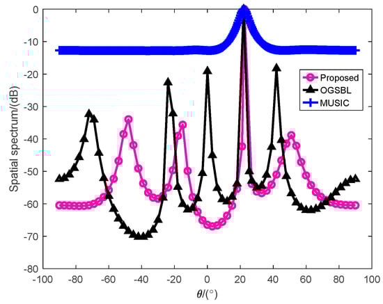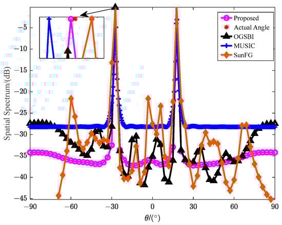 From Figure 10, we can see that the MUSIC method is relatively stable in the signal-independent direction, but its power spectrum curve has a wide-angle range in the incident angle direction; thus, the MUSIC method has a bad performance in the estimation of adjacent directions, and its resolution is relatively poor compared to the other two methods. The power of the OGSBL method and the proposed method is concentrated in the direction of the incident angle, so these two methods have better resolution. However, the OGSBL method generates four pseudo-peaks and the maximum value reaches −20 dB, which will interfere with its application in practical engineering, while the proposed method generates only two pseudo-peaks and its maximum peak only reaches −30 dB, which is smaller than that of the OGSBL method. Therefore, our proposed method is far superior to the OGSBL method. Overall, the performance of the proposed method is better than that of the other methods.